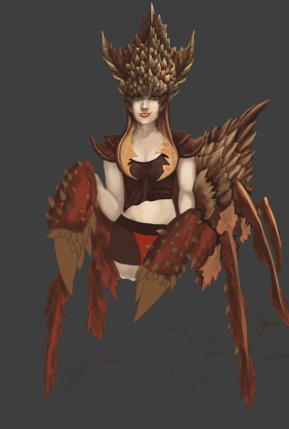 I worked on the body and the legs. Originally her body was more red but I decided I wanted it to match the head piece she has so I went over it again.